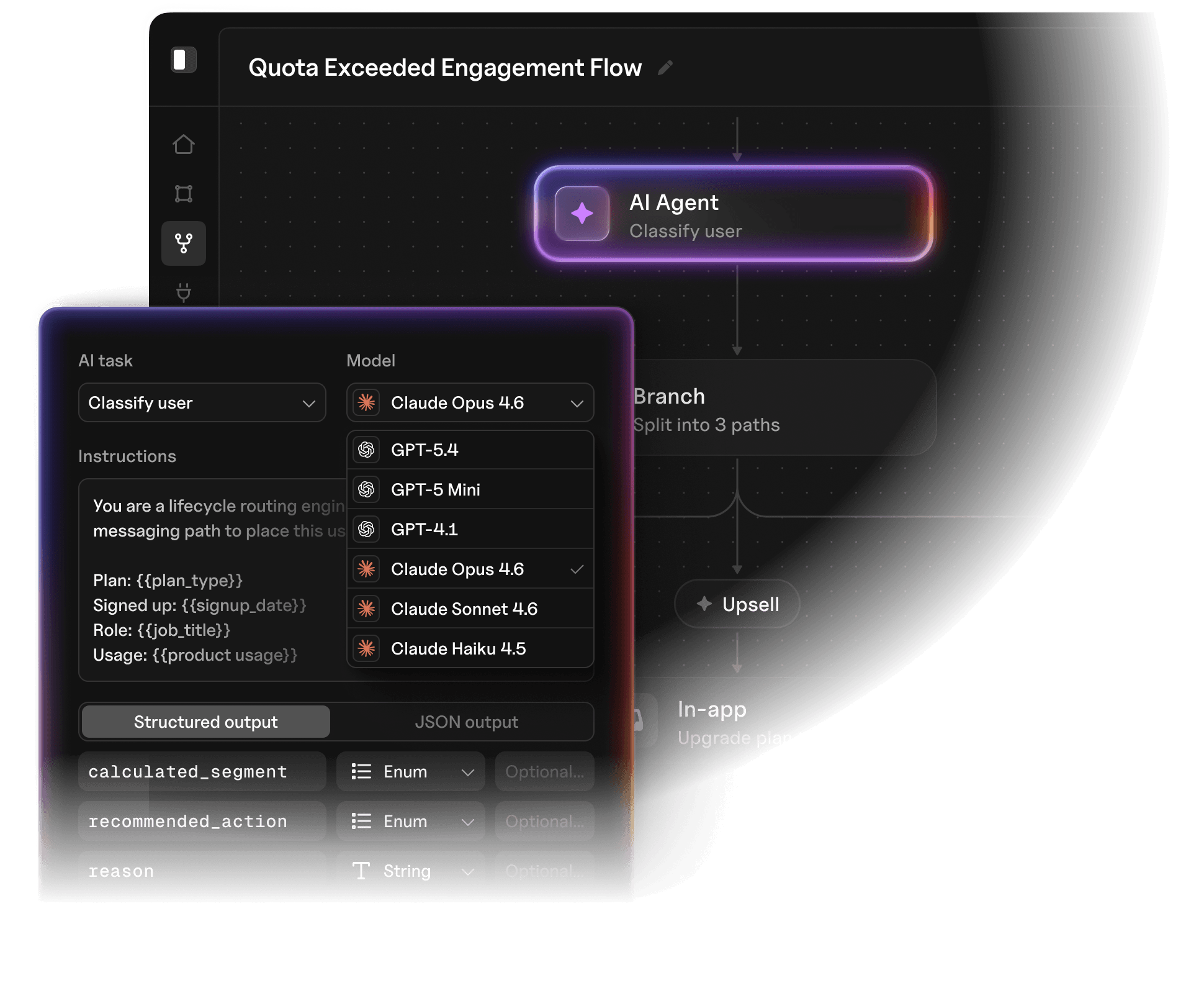 Run GPT-5.4, Claude Opus, and other frontier models as a step in any workflow. Score users, generate personalized content, enrich profiles, and return structured output your branches, sends, and integrations act on directly.