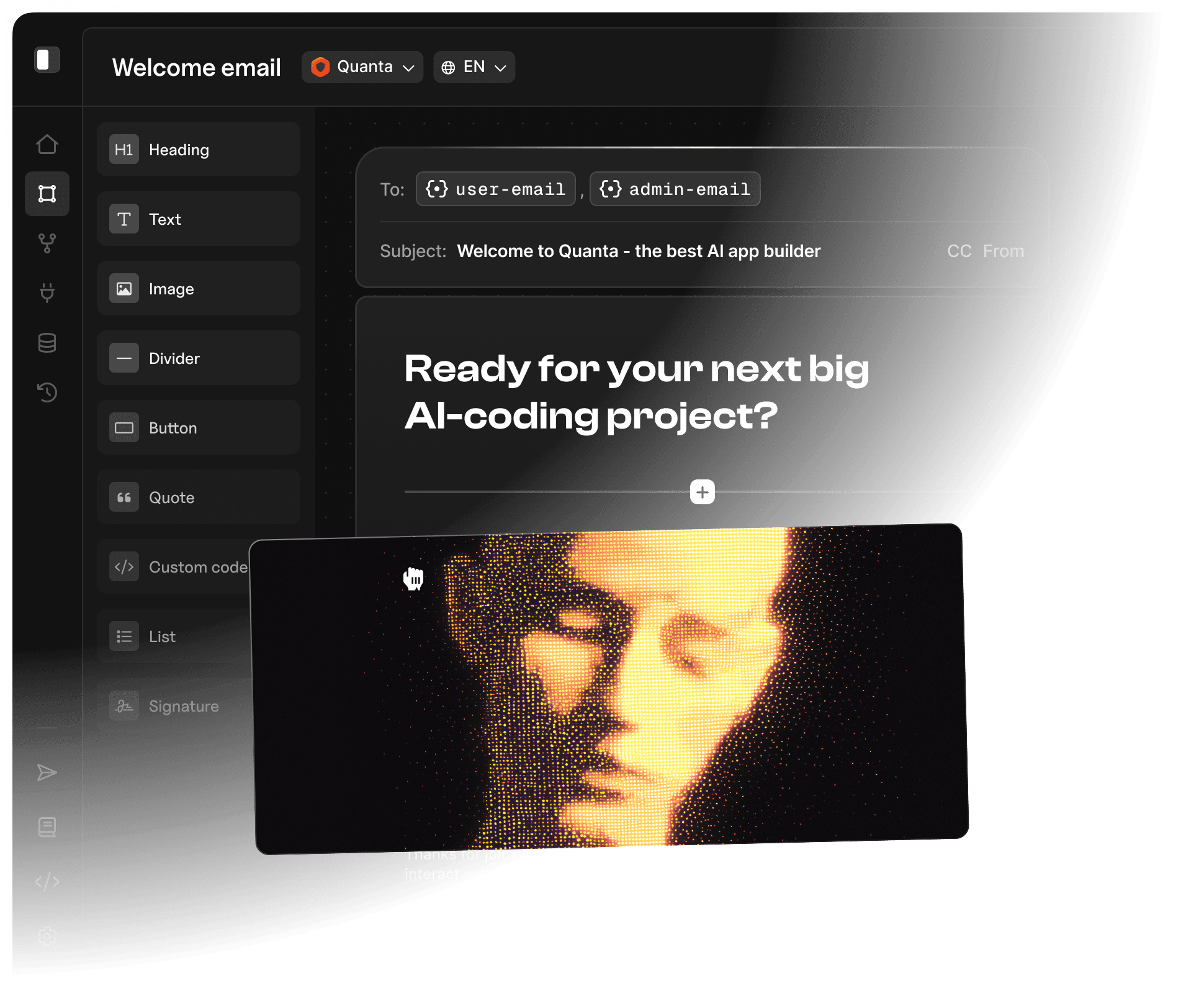 Design content without code and ship updates in minutes. Drop-in visual editor for you or your customers, with multi-channel preview on one canvas.