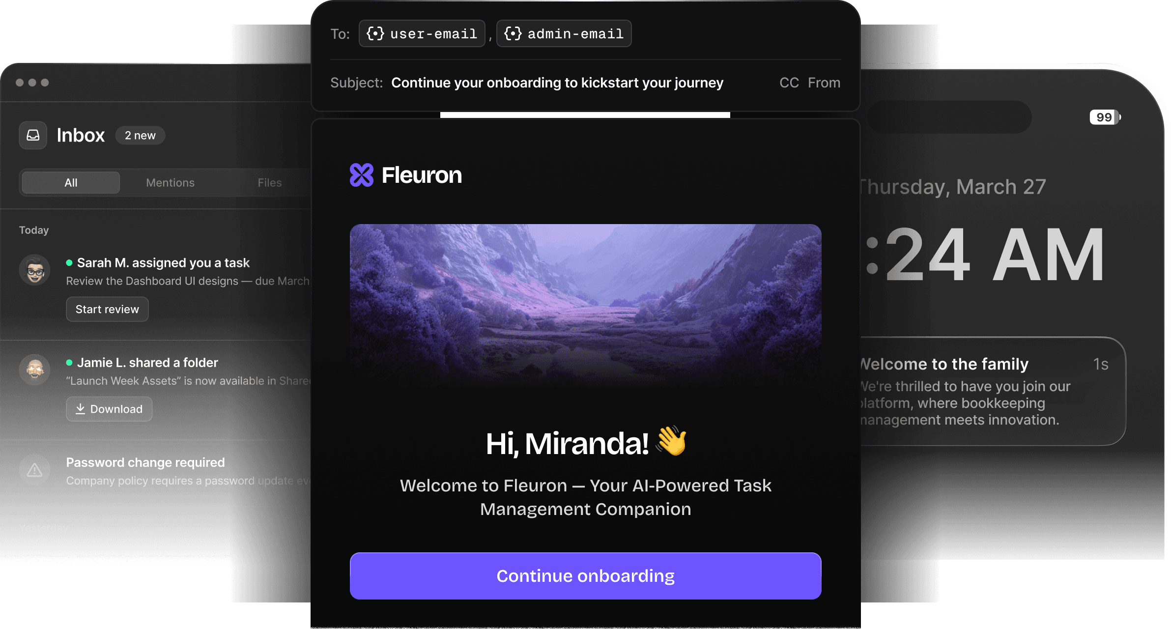 Embed a notification center into your product with custom components that fit with your design. Real-time sync across devices for a fully integrated messaging system.