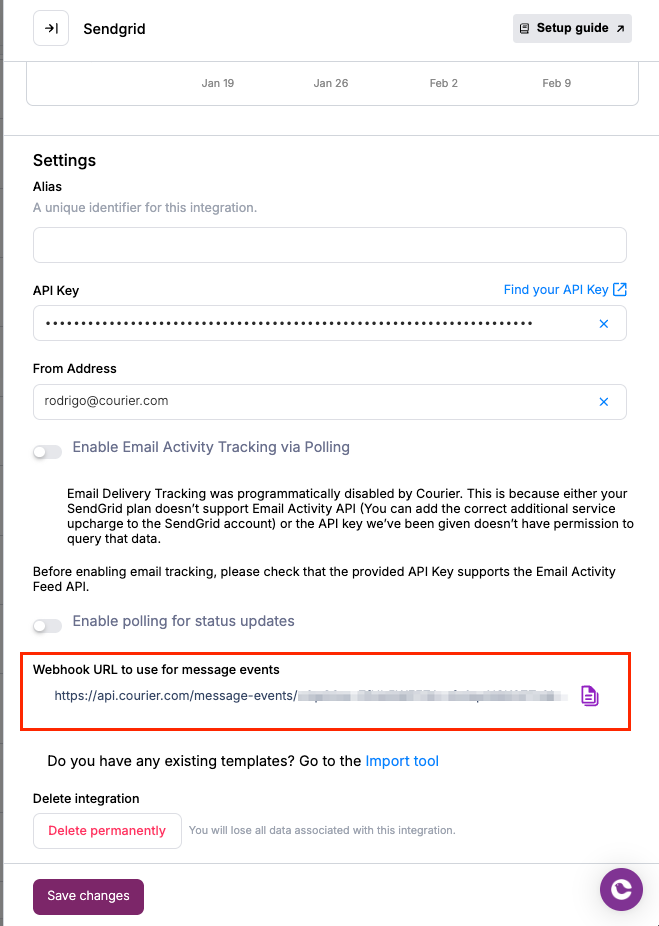 By default, after we send a message, Courier will poll SendGrid periodically to find out if the message was delivered successfully or not. To get faster status updates, you can setup a webhook so SendGrid can report delivery status directly to Courier.Get Webhook URL