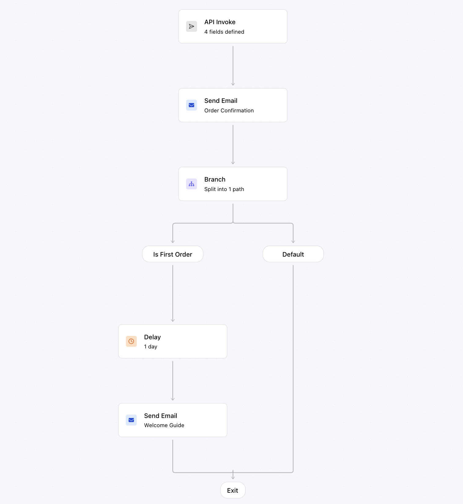 | Branch | Split the journey into multiple conditional paths. The first path whose conditions are met executes; unmatched runs take the Default path. | Branch reference |