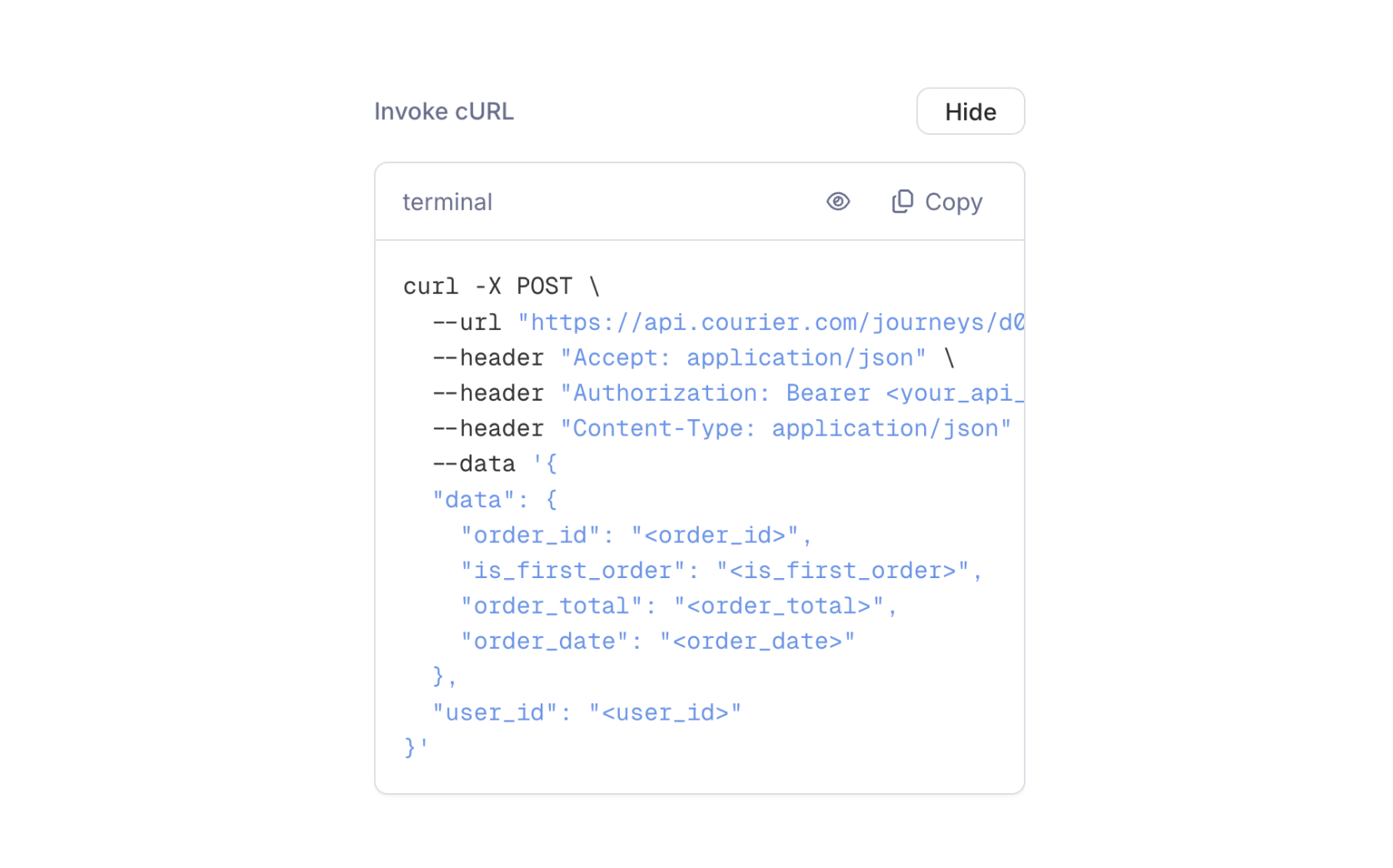 The API trigger introduces a contract between your application and Courier. You define a schema on the trigger (field names and types), and Courier uses it to power autofill and variable hints throughout the journey editor. Any field you declare becomes available as a variable in every downstream node. Courier does not reject invocations that omit schema fields. If your payload is missing a field that a node references, the journey will proceed until it reaches that node and then fail there. Defining an accurate schema keeps things predictable and makes building in the editor much faster.Define a Schema