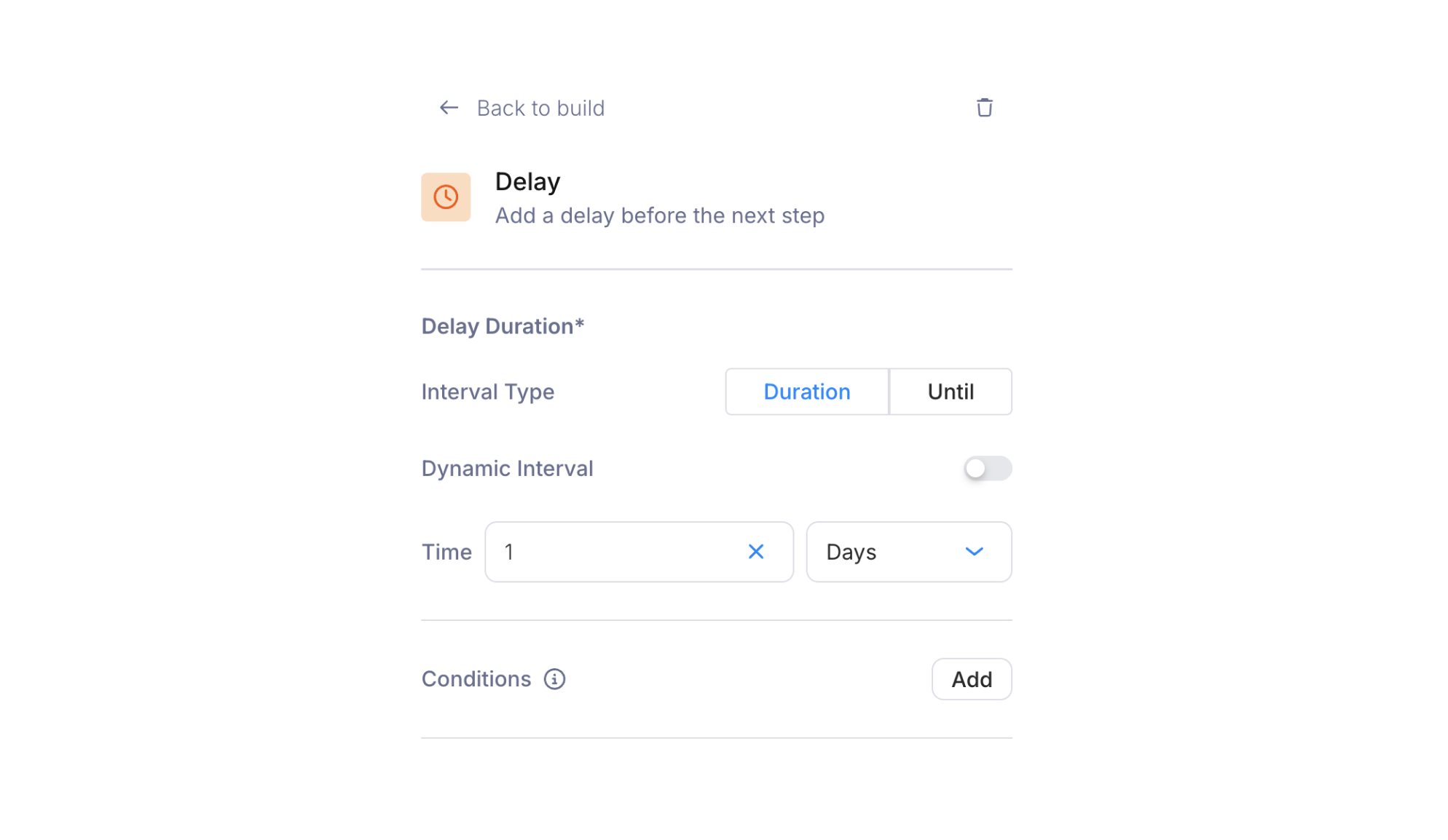Toggle between two modes:- Duration — Wait for a relative period of time. Set a numeric value and a unit: Minutes, Hours, Days, or Months. The delay is relative to when the run reaches the node, not when the journey was invoked.