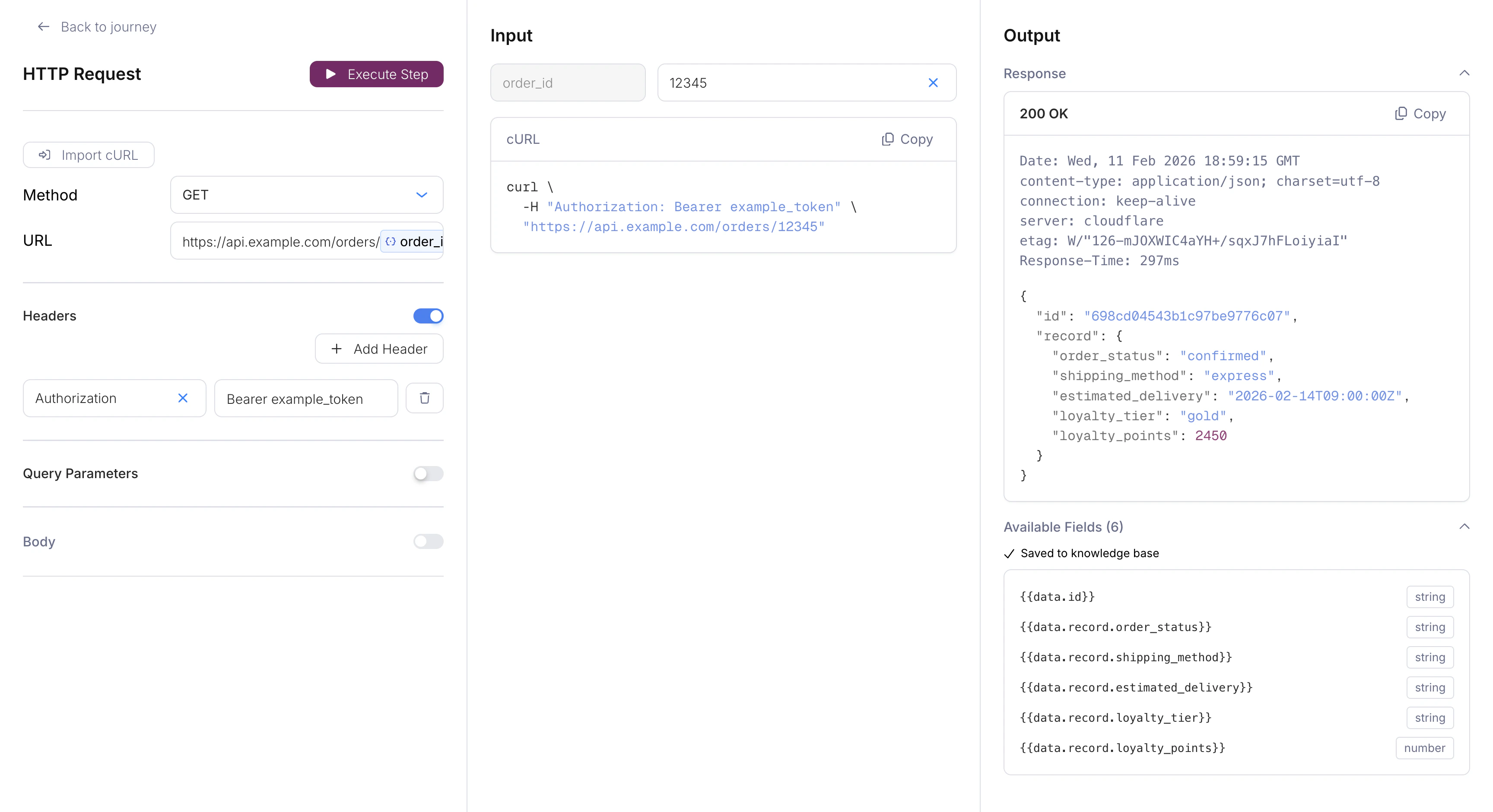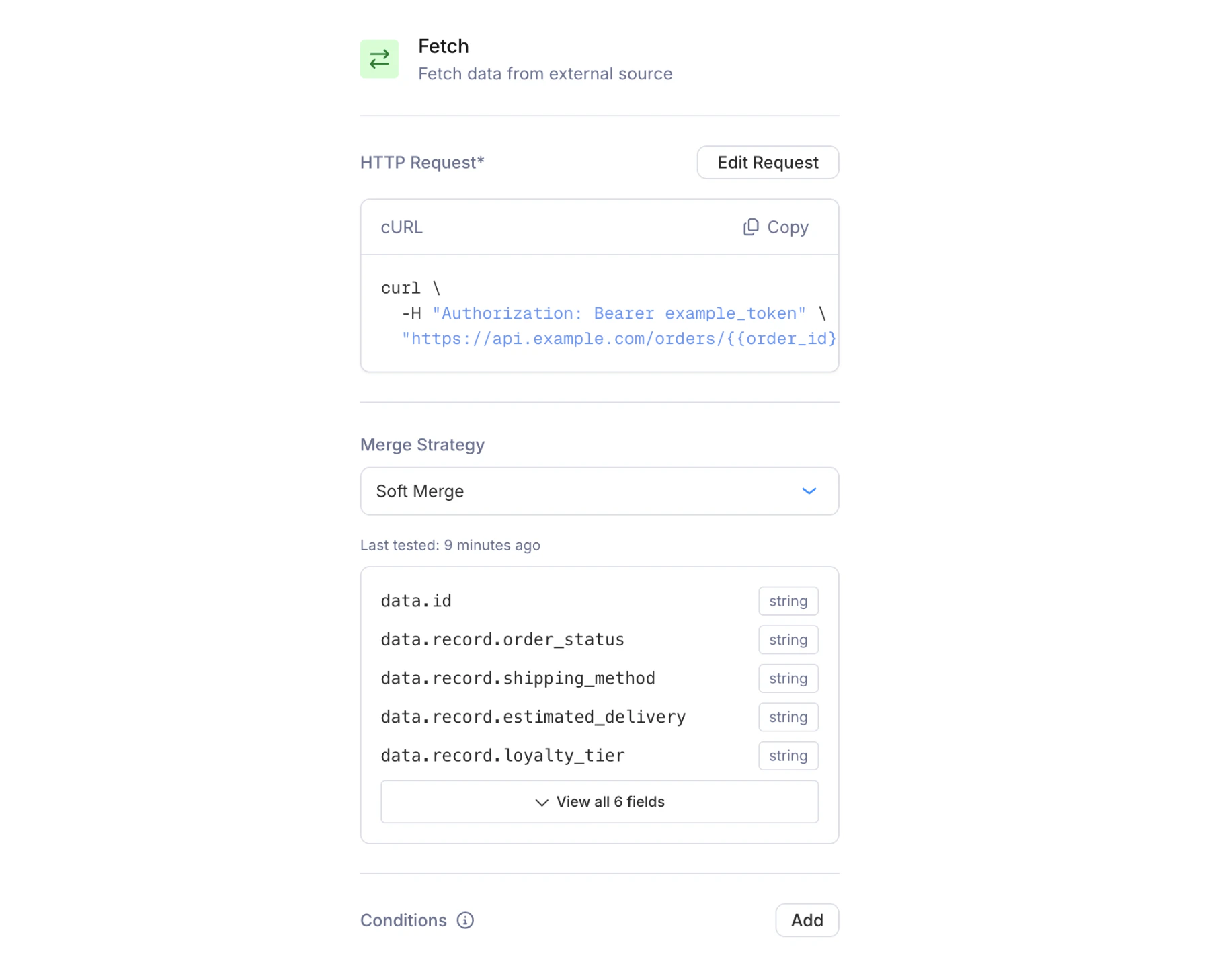 Like other nodes, fetch nodes support optional conditions. If the conditions are not met, the node is skipped and the journey continues without making the HTTP request.Response Handling