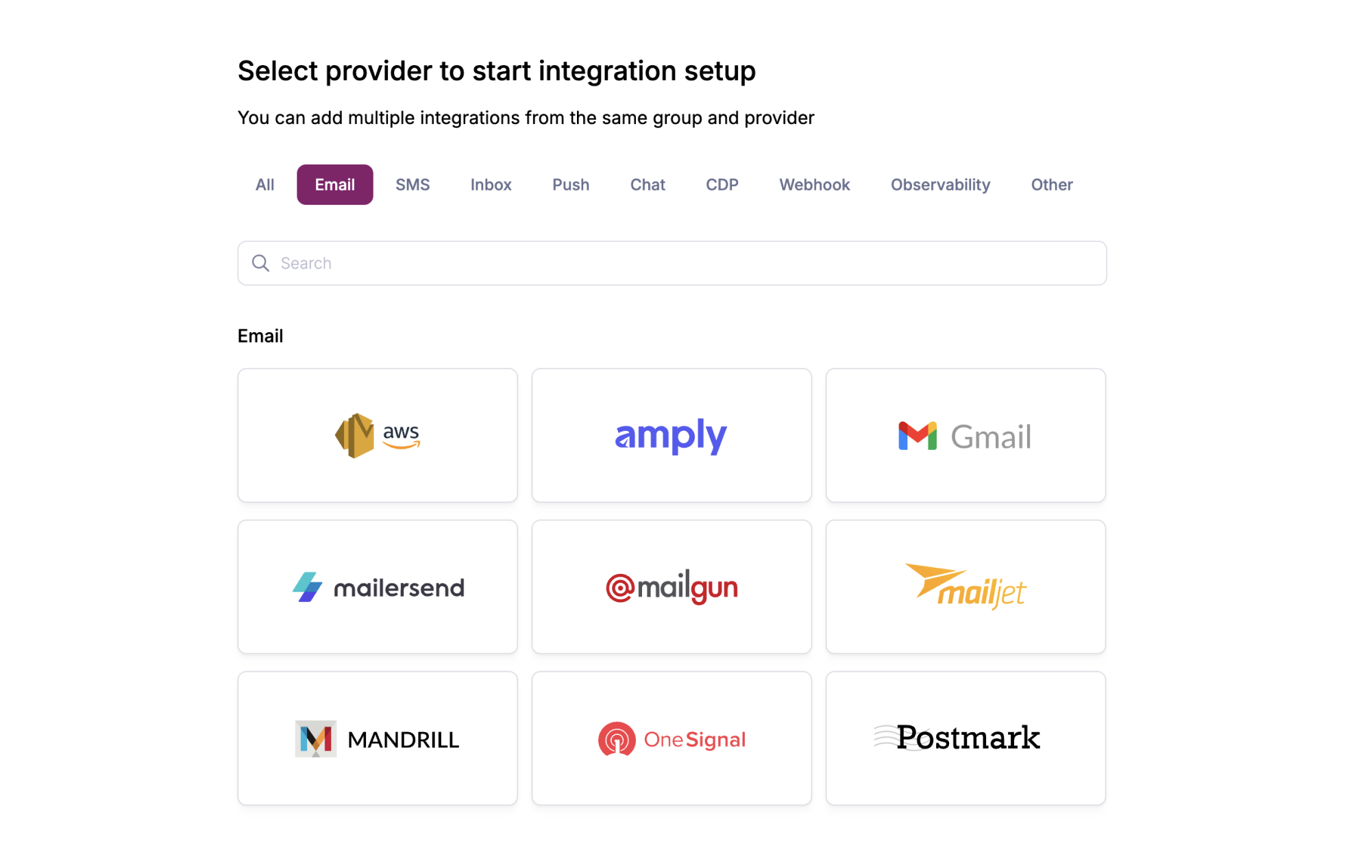 Providers you’ve already configured appear under “Configured” in the integrations list. You can add multiple providers per channel and set priority rules to control failover.