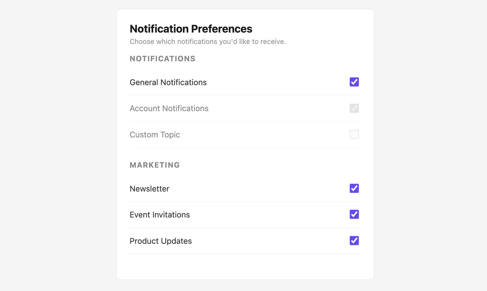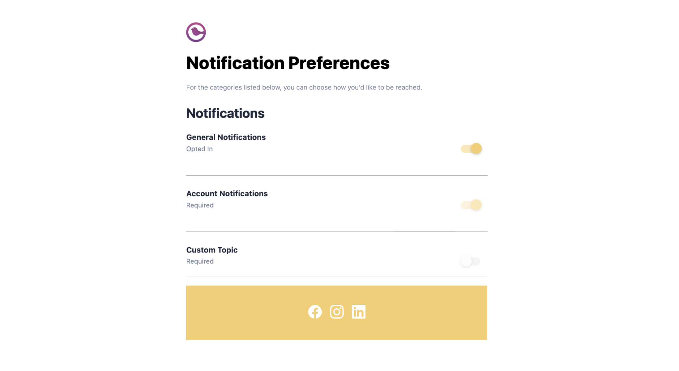 By the end of this tutorial, your users will be able to toggle notification topics on/off, choose delivery channels (Enterprise), and subscribe to digests directly in your app.