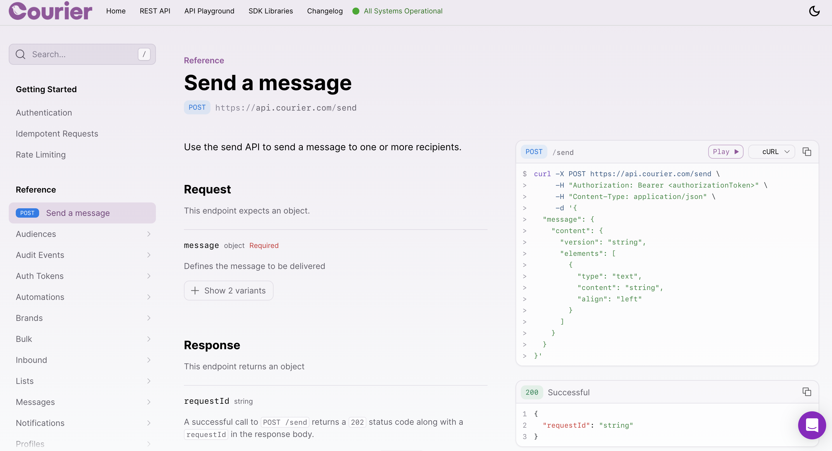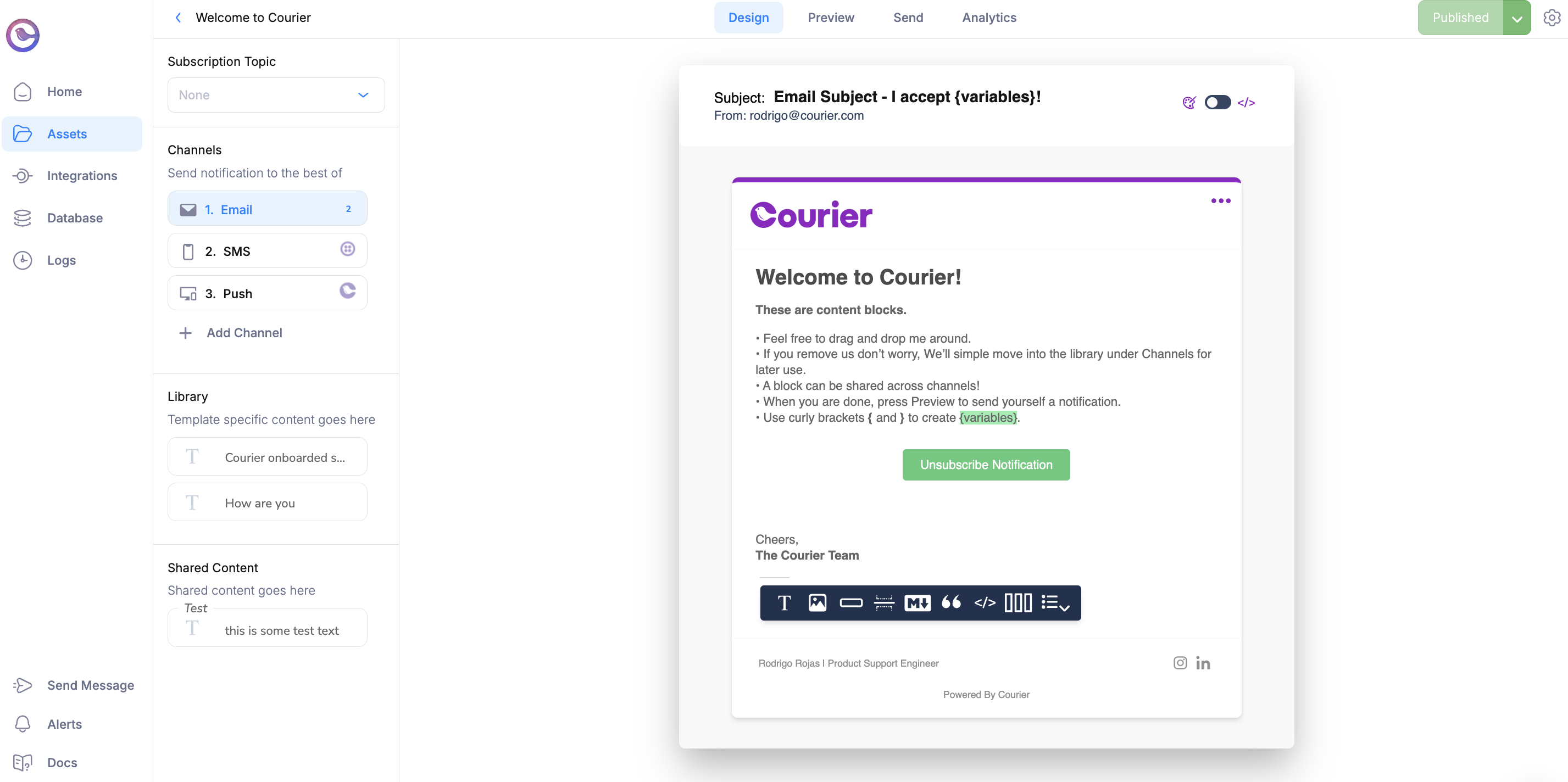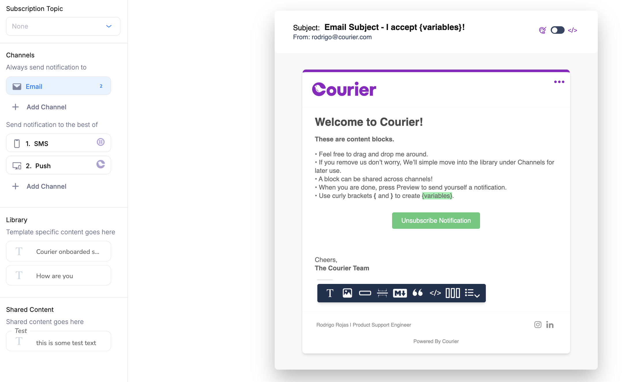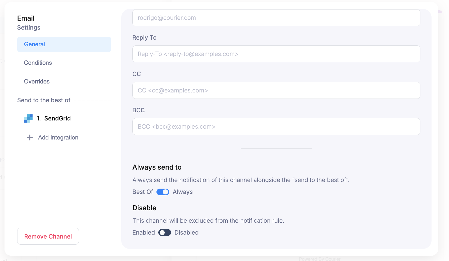 method property is defined as all, Courier will attempt to send messages to all listed channels. In the example below, Courier will send the message via email and SMS. Since the push and chat profile requirements are not completed, it will not be able to send via those channels.