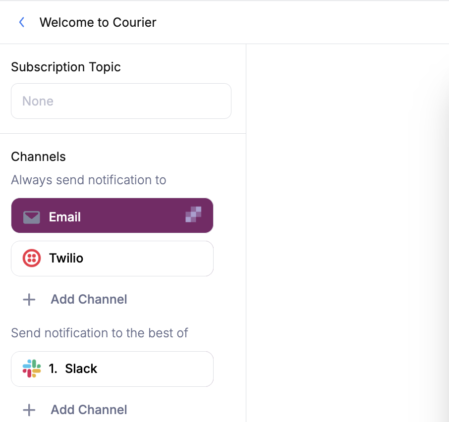 When the method property is defined as single, Courier will attempt to the send messages to only one channel. In the example below, it will first attempt SMS and fail since phone_number is not included in the user profile. Next, it will attempt to send via email instead. If the email is sent successfully, it will not attempt to send a push or chat notification.