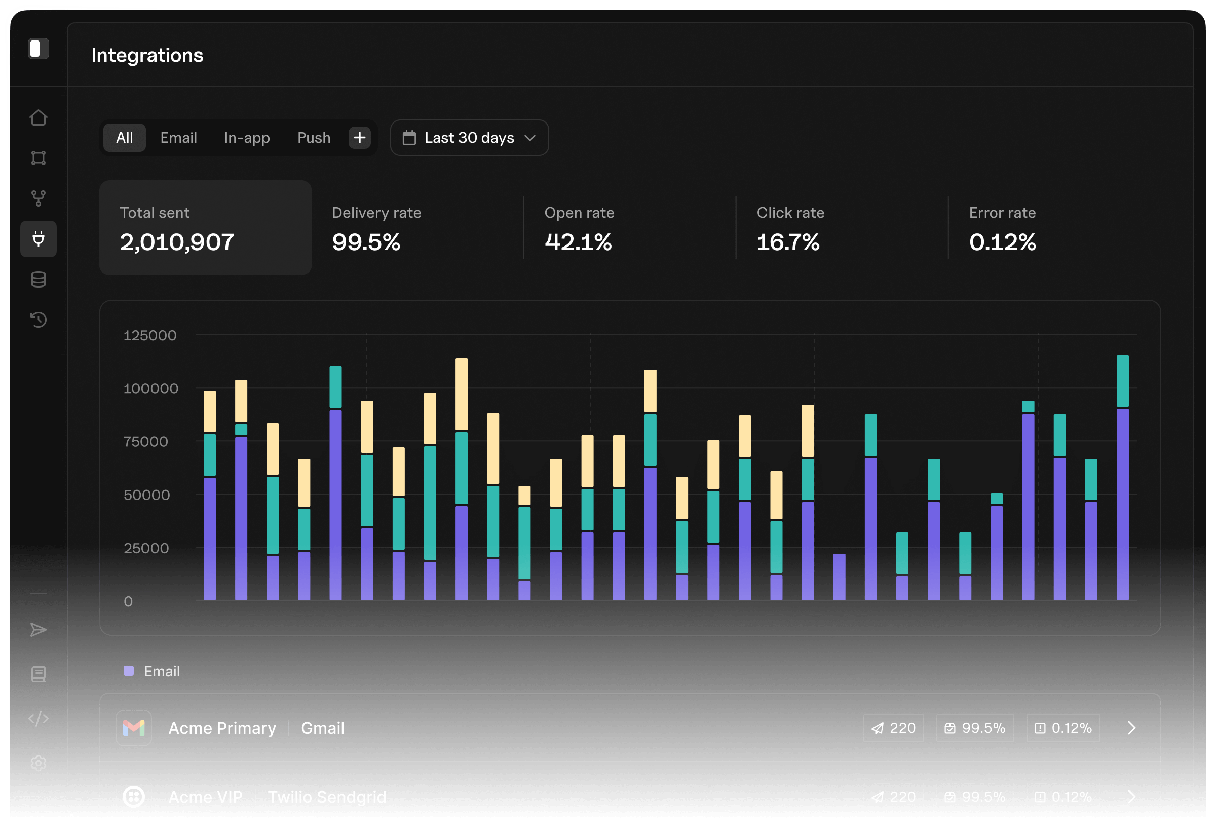 Monitor delivery, open, click, and failure for every notification and auto-retry or reroute