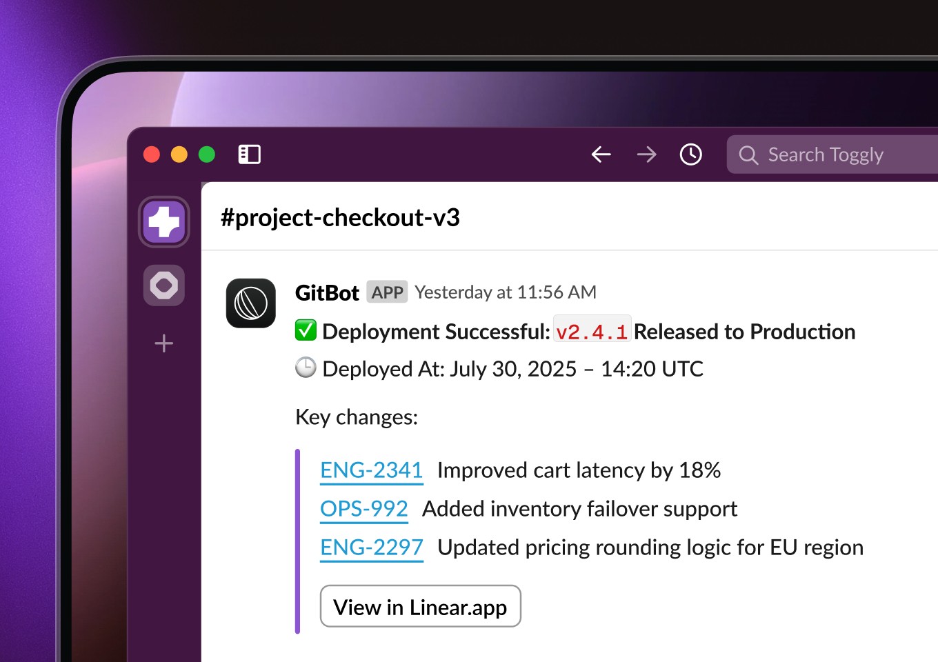 Keep everyone in sync from commit to production. Deliver updates where developers work without the noise.